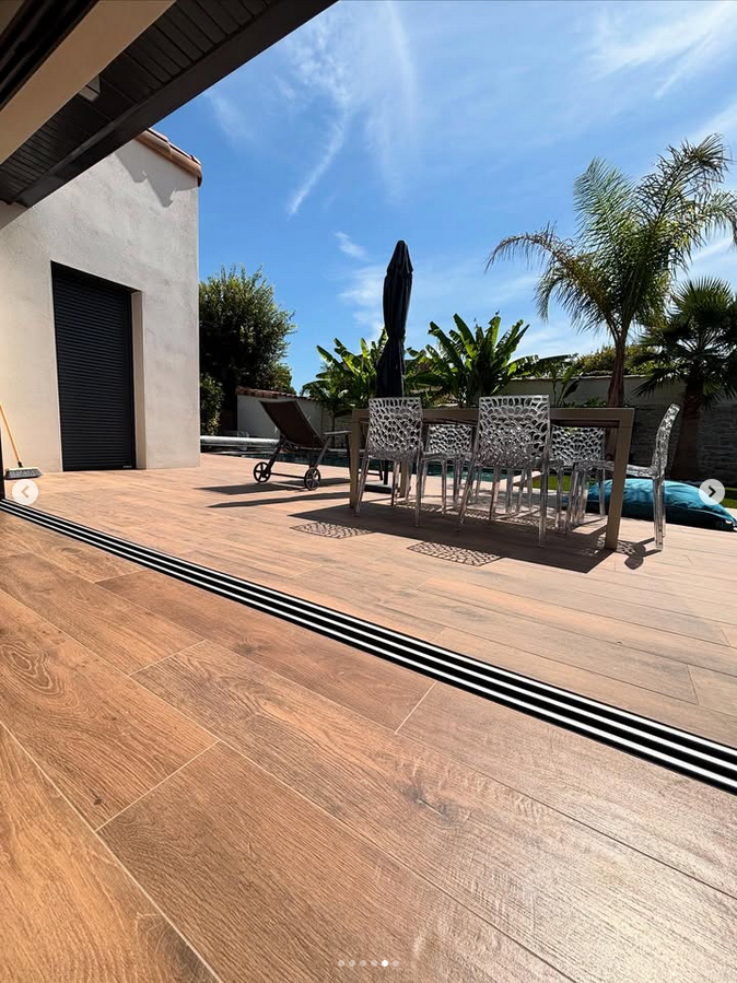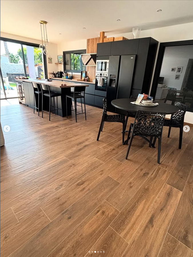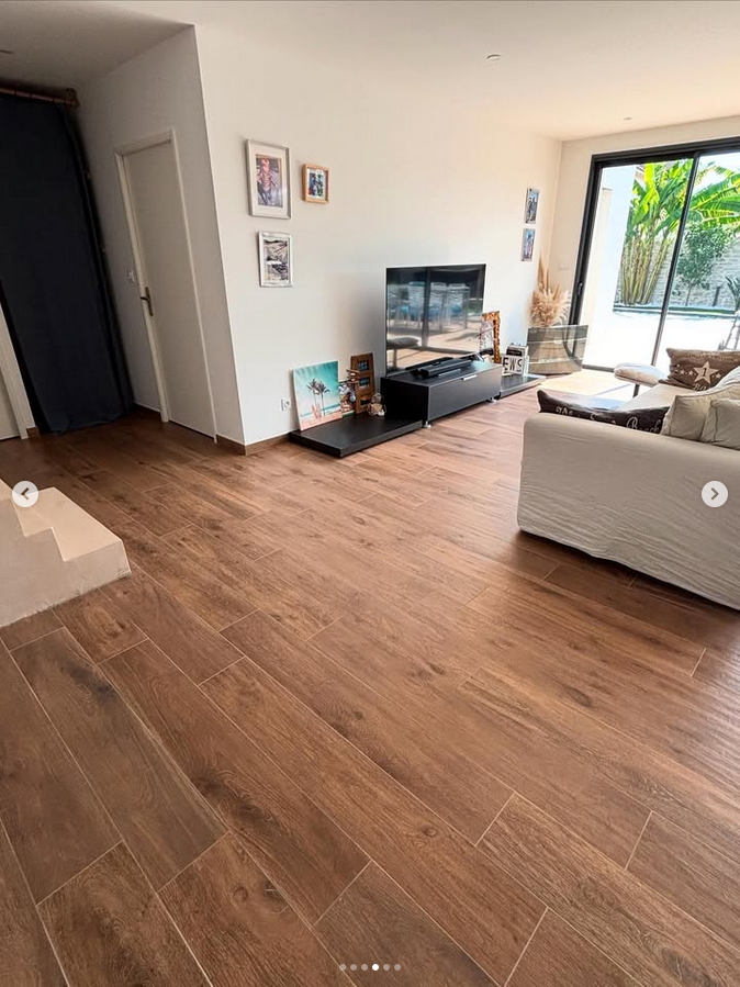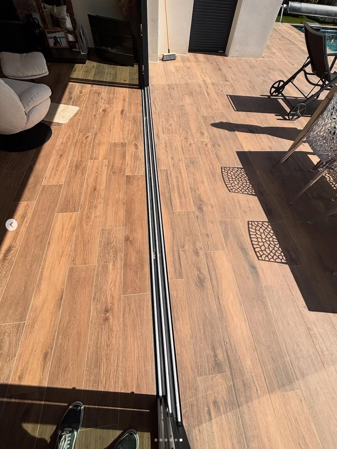 Chape fluide et pose d’imitation parquet avec baie vitrée seuil encastré